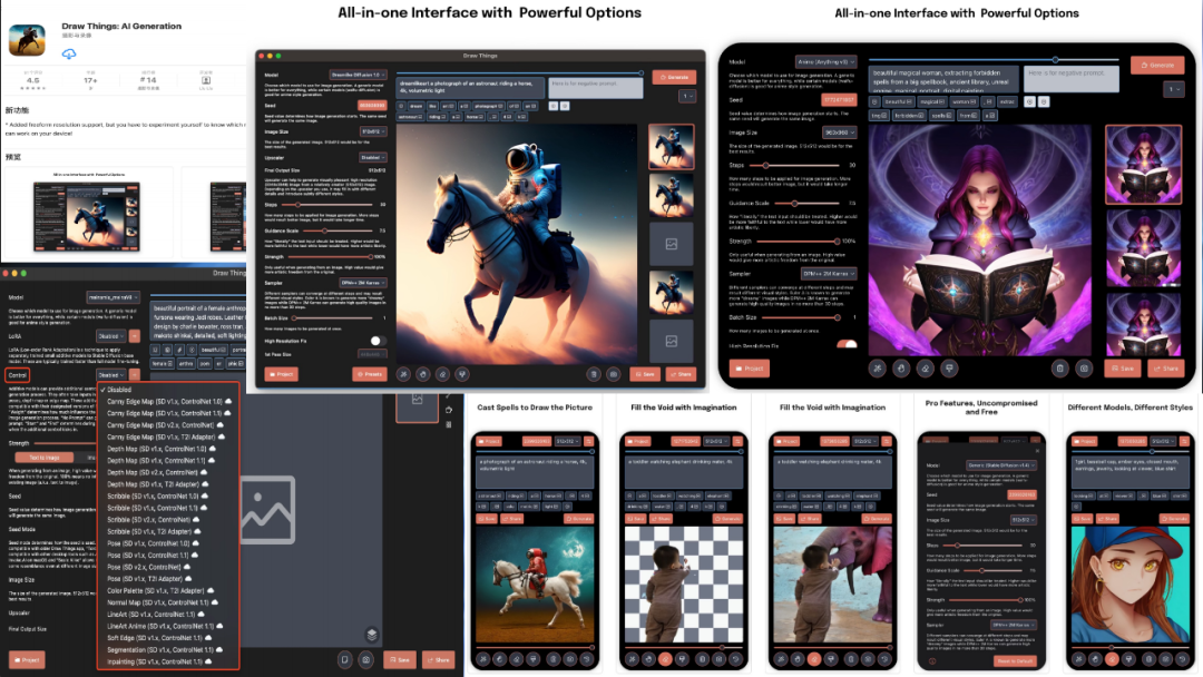 Draw Things 提供了 iPad 和 iPhone 版本的应用供下载,但是需要注意的是其中的模型包较大,此外由于依赖于设备本身处理效能,跑图的速度也可能较慢。与电脑端相比,操纵也不那么方便(有兴趣可以试着下载尝试)。