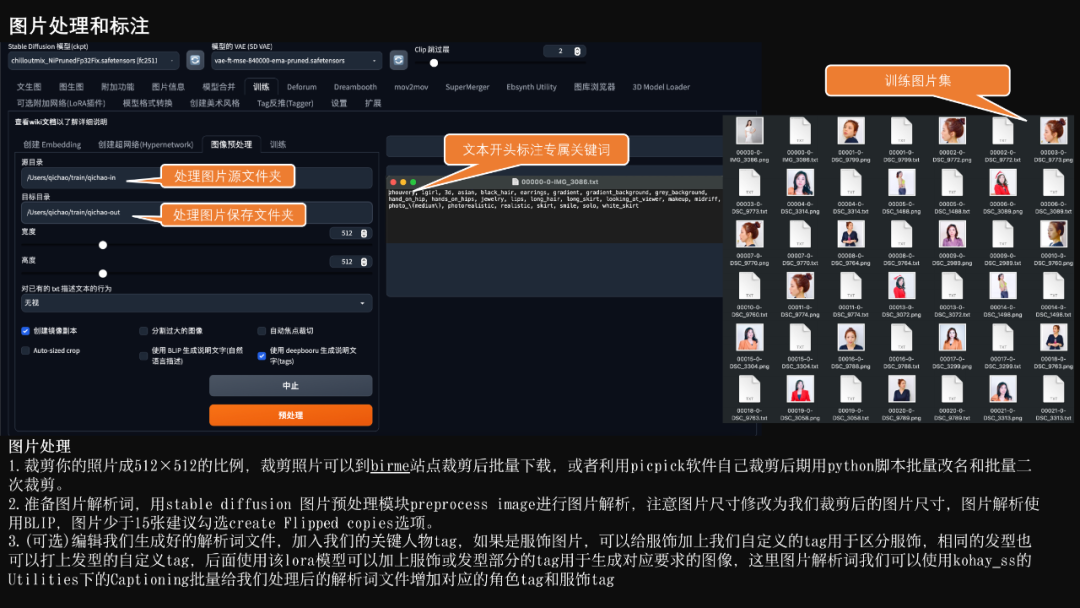 训练图集可以通过Stable Diffusion预处理整理,记得打上专属的触发关键词,在使用的时候方便触发。