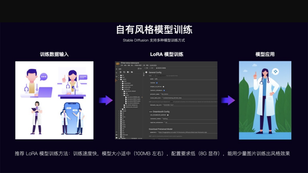 Stable Diffusion 的强⼤之处还在于能够⾃定义训练⻛格模型,如果现有⻛格⽆法满⾜要求,我们还可以⾃⼰训练特定⻛格模型。Stable Diffusion ⽀持训练⼤模型和微调模型。我⽐较推荐的是⽤ LoRA 模型训练⽅法,该⽅法训练速度快,模型⼤⼩适中(100MB 左右),配置要求低(8G 显存),能⽤极少量图⽚训练出⻛格效果。