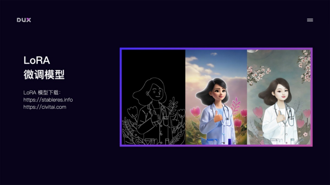 例如:下图中我⽤了 10 张⼯作中的素材图,⼤概花了 20 分钟时间训练出该⻛格的 LoRA 模型,然后使⽤该模型就可以⽣成⻛格类似的图⽚。如果将训练样本量增⼤,那么训练出来的⻛格样式会更加精确。