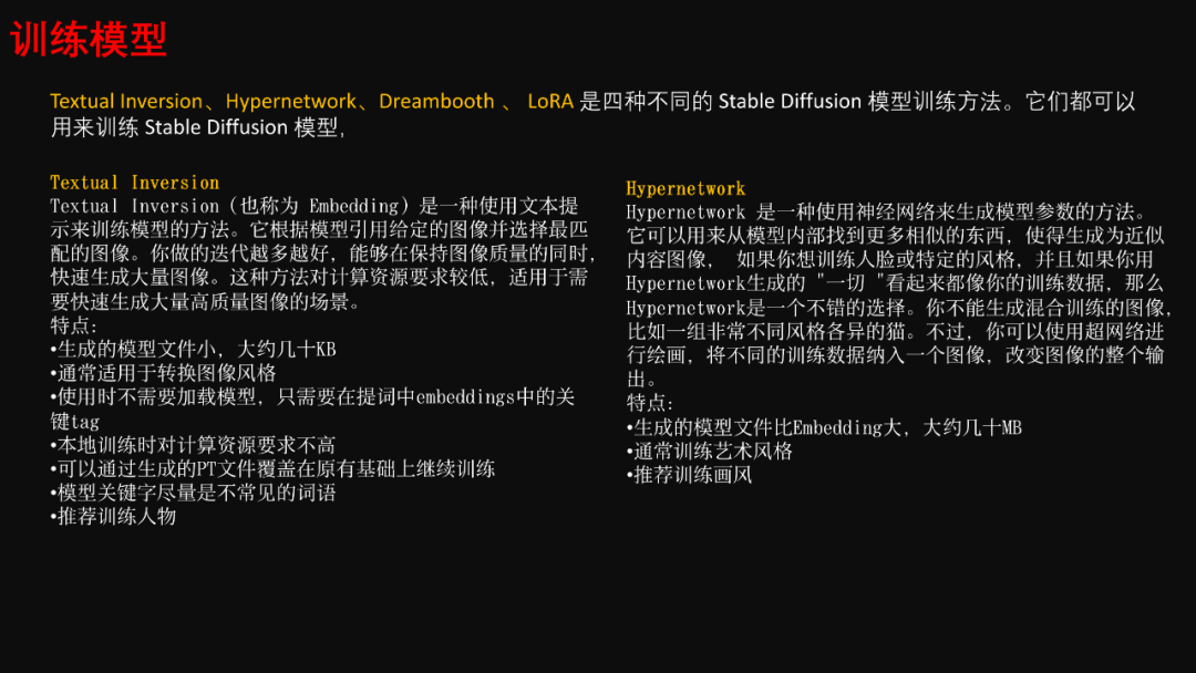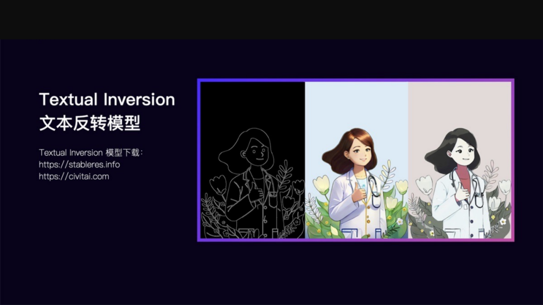 Textual Inversion ⽂本反转模型也是微调模型的⼀种,它是针对⼀个⻛格或⼀个主题训练的⻛格模型,⼀般⽤于提⾼⼈物还原度或优化画⻛,⽤这种⽅式⽣成的模型⾮常⼩,⼀般⼏⼗KB,在⽣成画作时使⽤对应 Tag 在 prompt 中进⾏调⽤。