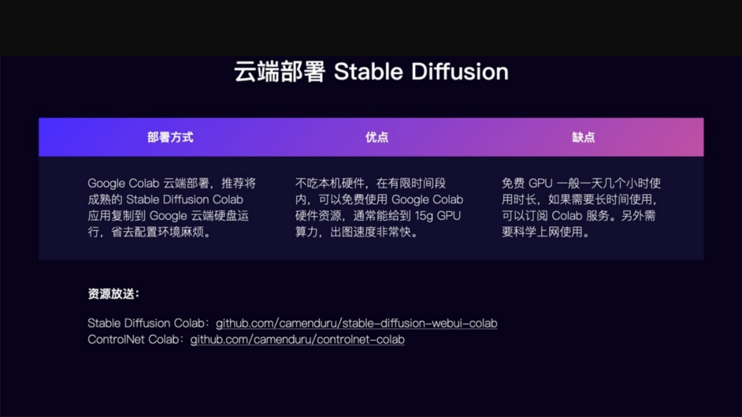这种部署⽅式的优点是:不吃本机硬件,在有限时间段内,可以免费使⽤ Google Colab 强⼤的硬件资源,通常能给到 15G 的 GPU 算⼒,出 图速度⾮常快。
