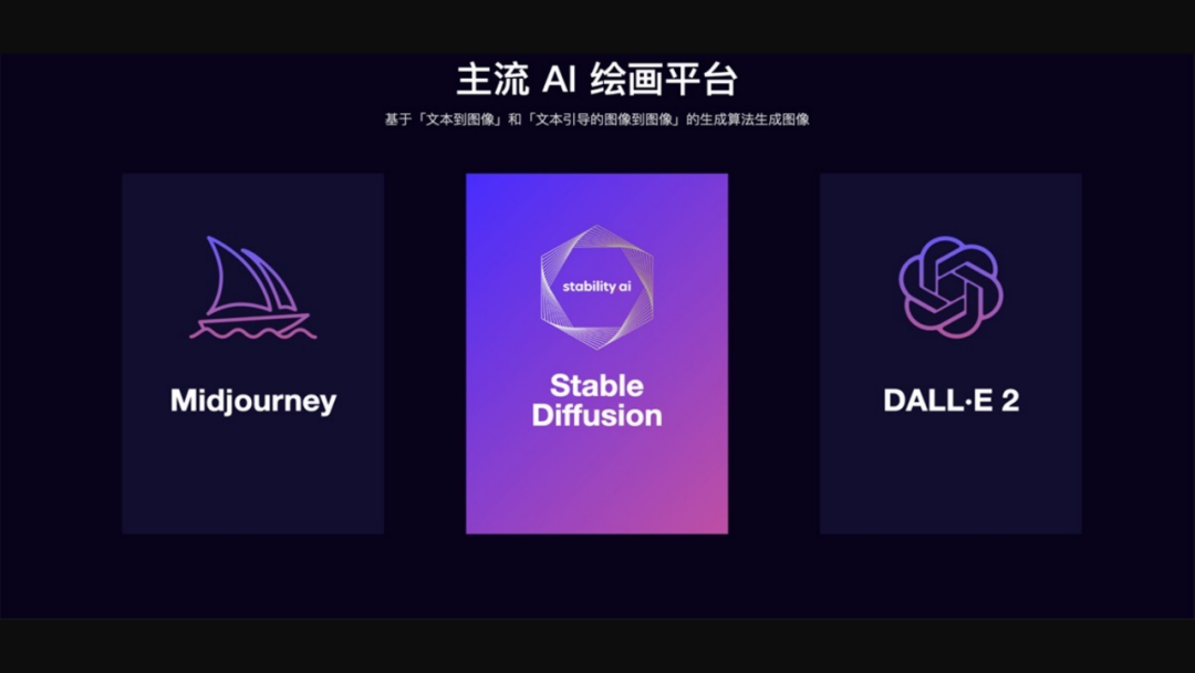 ⽬前⽂⽣图的主流 AI 绘画平台主要有三种:Midjourney、Stable Diffusion、DALL·E。
