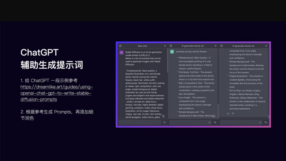 给 ChatGPT ⼀段示例参考:https://dreamlike.art/guides/using-openai-chat-gpt-towrite-stable-diffffusion-prompts