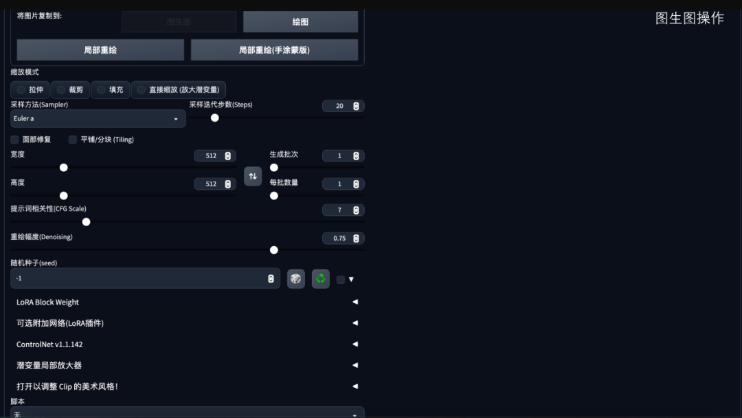Denoising strength:重绘幅度,值越⼤越⾃由发挥,越⼩越和原图接近
