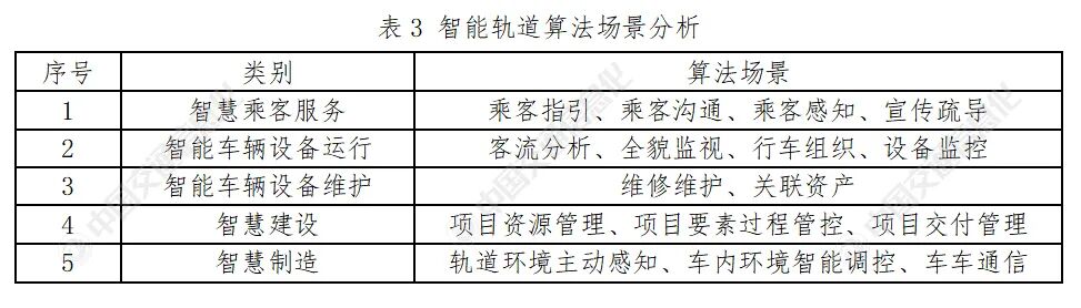 通过运行状态监测、视频图像监测、故障预警监测等信息的全覆盖,打造智慧乘客服务、智能车辆设备运行、智能车辆设备维护、智慧建设、智慧制造等,实现对轨道交通运输体系中各种要素,如人、车辆及设备设施、环境等的全面感知、泛在互联、协同运行。智能轨道算法场景类别与分析见表3。