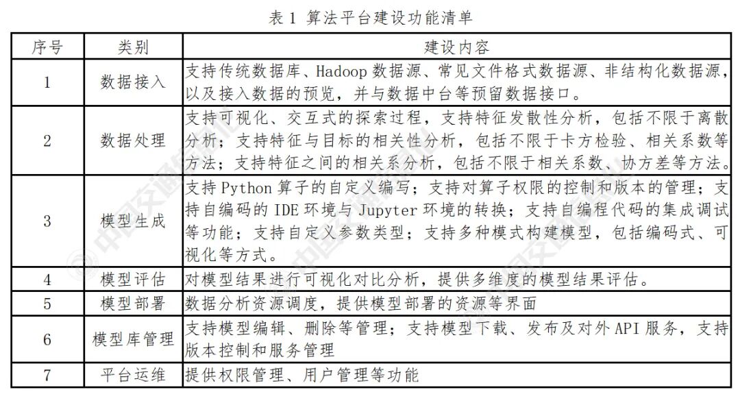 算法研究标准化流程应包括业务需求分析、算法需求分析、基础数据预处理、算法选择、模型参数调优、模型评估、模型部署/测试、模型优化,直至模型上线,具体流程如图1所示,建设功能清单见表1。
