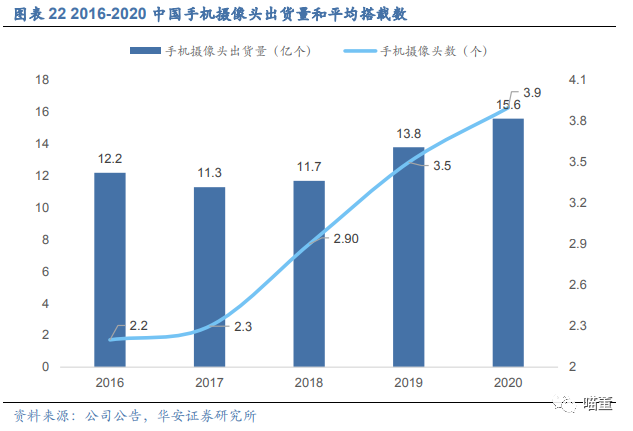 手机摄像头出货量超60亿颗,后续有望进一步上升。随着用户对手机摄像需求的提升以及多摄技术成熟度的提升,2016年到2020 年,手机平均搭载摄像头个数从2.2个上升到 3.9 个,平均每部手机增加1.5个摄像头。其也带动了在手机出货量连续三年下降的情况下,手机摄像头出货量连续增长。以国内为例,国产手机摄像头出货量从2018年的 11.7亿个增长到了2020 年的15.6亿个。