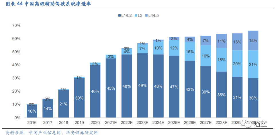 政策端,我国高度重视智能汽车产业,2020年,国家发改委、科技部、工信部等 11 个部门联合印发《智能汽车创新发展战略》,提出到 2025 年,中国标准智能汽车的技术、产业、设施、法规、监管和网安体系基本形成,并实现有条件自动驾驶的智能汽车达到规模化生产。供给端,视觉传感器、毫米波雷达、激光雷达等技术进一步成熟,英伟达、TI 等车载计算芯片供应商推出大算力芯片 为 ADAS的发展奠定基础。未来政策和供给共振,驱动 ADAS 下游渗透率不断提升。