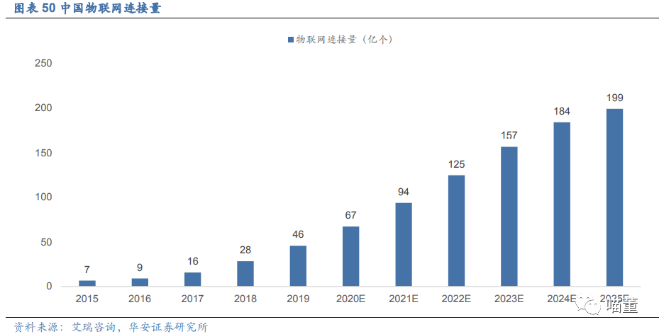 在AI视觉技术在多领域崛起,下游场景拓宽带来行业机会。在5G、大数据、计算机视觉等技术的带动下,智能物联网下游细分市场蓬勃发展,计算机视觉、语音等人工智能技术应用方向不断拓宽,应用场景日益丰富,覆盖金融、居民区、交通、教育、银行、 政府等方面。根据艾瑞咨询数据显示,国内物联网连接数从 2015年的7亿个增长到2019 年的46 亿个,未来在2025年有望达到199亿个。