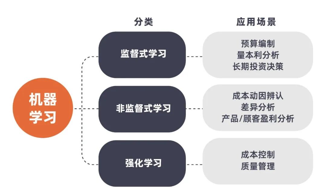 1.监督式学习:人需要提供数据,为数据贴标签,机器通过模仿人类的思维判断。会计与财务系统的数据标签最完整、数据结构化程度最高,因此监督式学习应用范围最广。典型场景如预算编制、投资决策等。