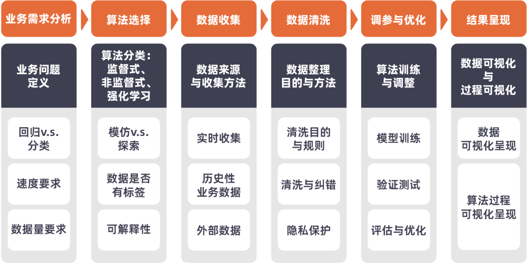 6.结果呈现:对数据分析的过程和结果进行可视化展现,可视化需覆盖算法落地全过程,以解决人对机器的不信任问题。