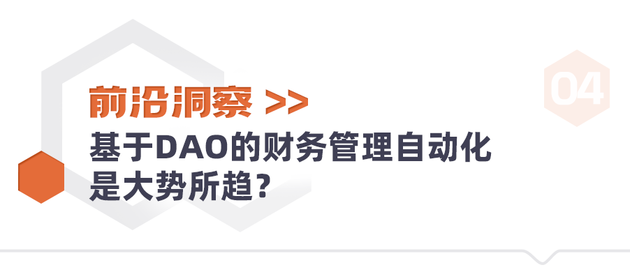 1.管理会计最终的智能化是要融合在企业整体的财务自动化流程中。通过将管理流程通过区块链的共识机制与智能合约转化为可自动运转的DAO(Decentralized Autonomous Organization),基于DAO实现财务管理自动化是一个最新的趋势。