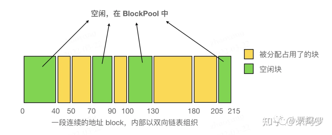 一段连续空间内部(由双向链表组织的 Blocks)如图所示: