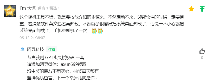 上一期文章已开奖,恭喜这位幸运粉丝~请及时添加阿寻微信领取。没中奖的朋友不要灰心,阿寻每天都会在文章留言区抽取一位粉丝,赠送「GPT永久授权码」一套!坚持留言,下一个中奖者就是你~