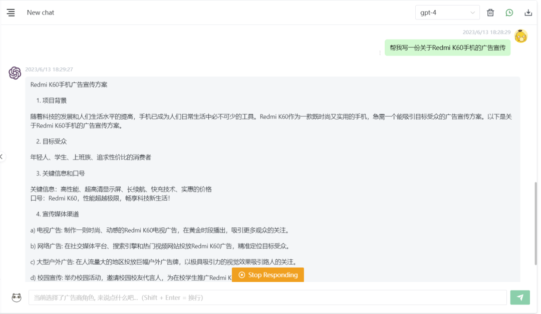 比如当我选择了广告商这个角色,再搭配上GPT-4.0模型,就能立刻帮我写出一份高质量的广告宣传方案。
