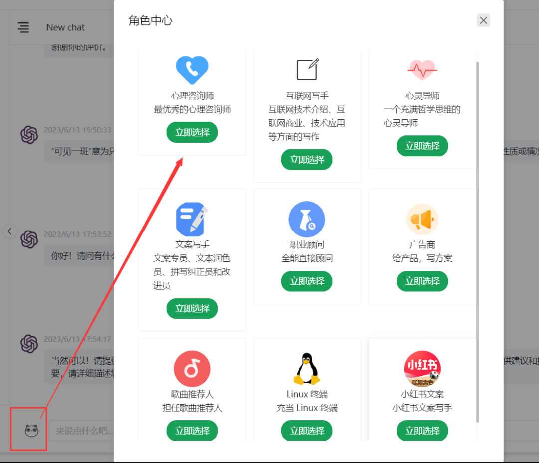 在对话框的旁边有一个熊猫样的图标叫做角色面具,打开它就能让GPT为你扮演各种角色,生成更符合要求的文稿。