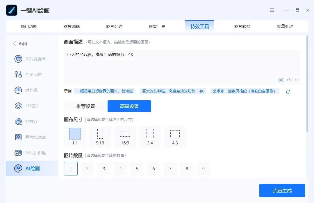 除了AI绘画功能,一键AI绘画还具备一些其他功能,如老照片修复、图片去水印等,是一款非常实用的图像处理软件。