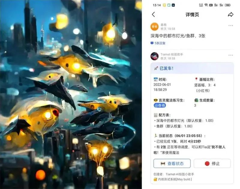 国内的 AI 图像生成器,程序服务与社群目前都是放在飞书上运行的。其优点在于支持纯中文提示词,图像生成速度在 5-6 分钟,图像质量非常不错,且图像风格与国外的 Disco Difussion 和 Midjourney 相比有明显的中国风特色。