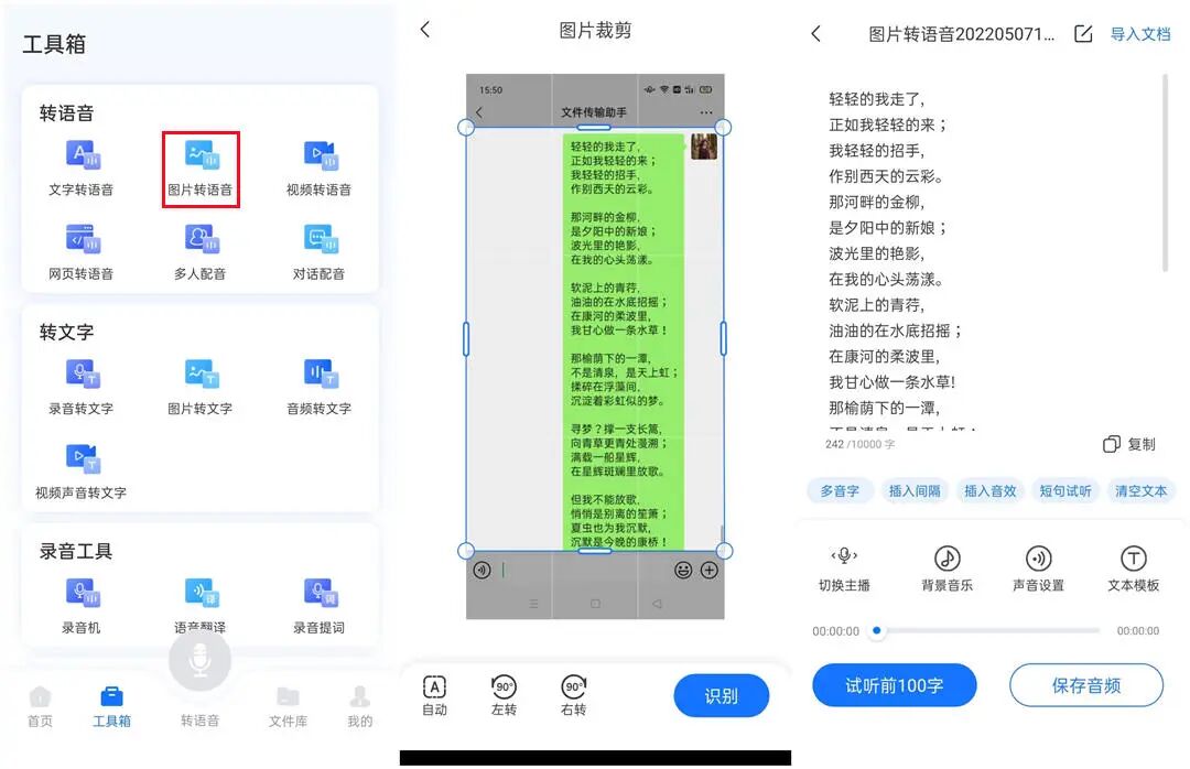 有时候我们会对聊天记录等内容进行截图,也可以通过工具箱里的【图片转语音】来识别图片里的文字内容,并且转换为语音。