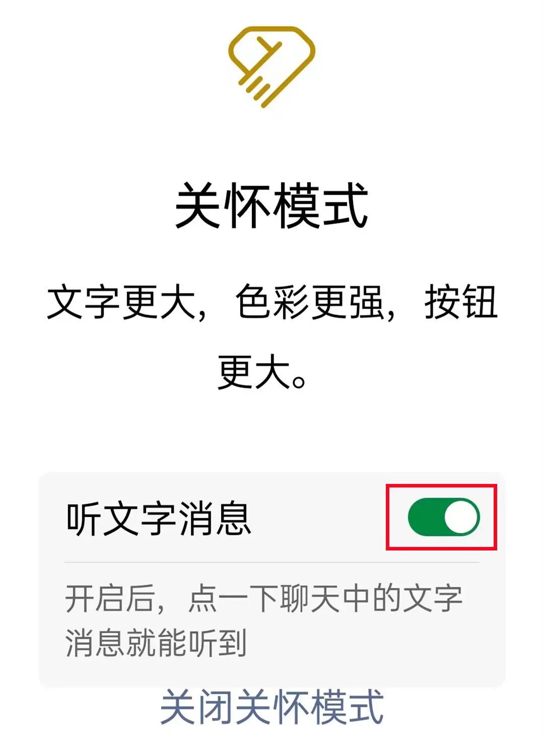 重启微信后,可以看到【关怀模式】的界面多了一个新的功能:听文字消息。