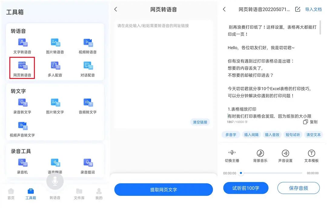 如果你想要阅读一篇网页文章,也可以使用【网页转语音】工具,输入链接就可以自动识别网页文字,并且转为语音朗读,实现文章的收听。