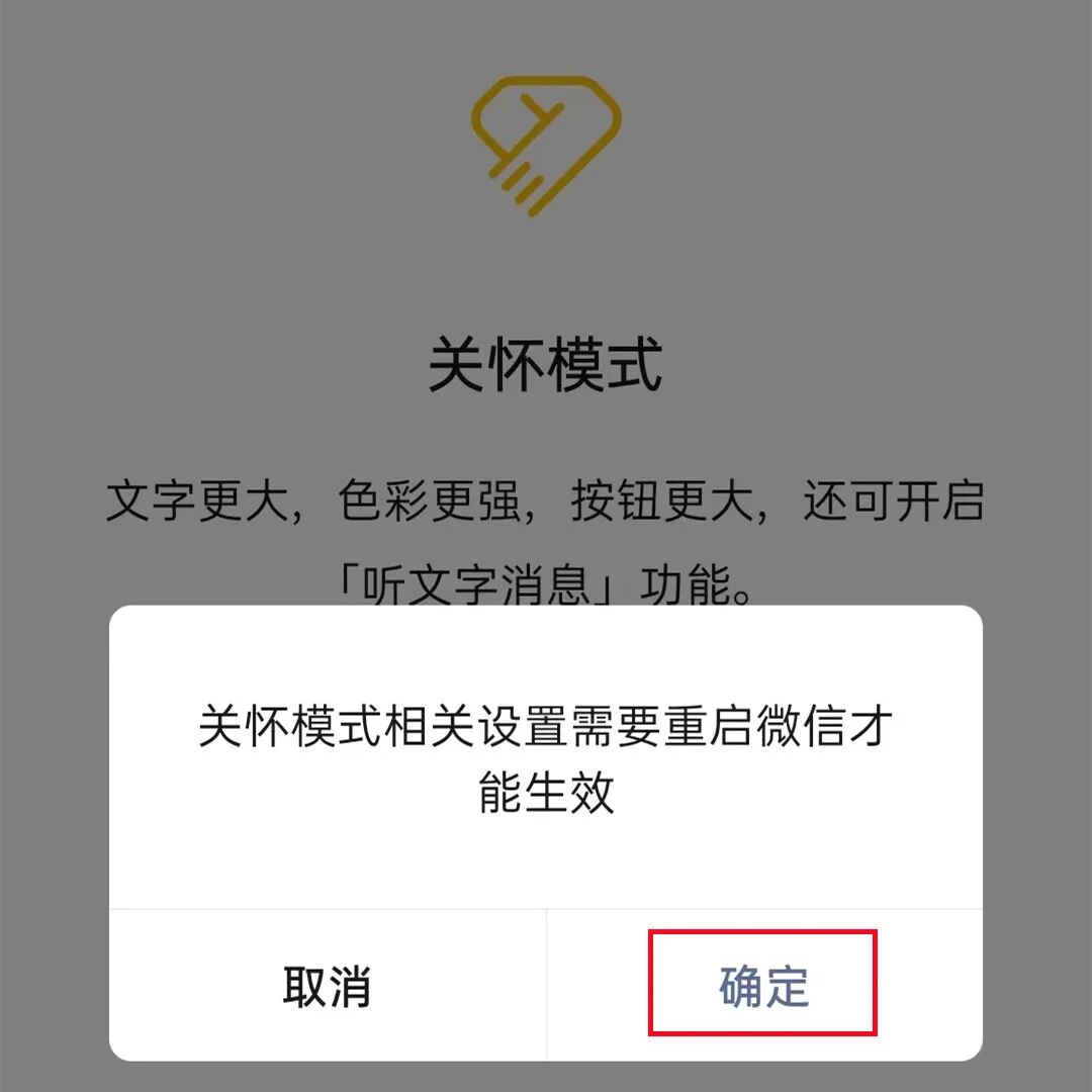 打开【关怀模式】需要重启微信,我们点【确定】就可以了。