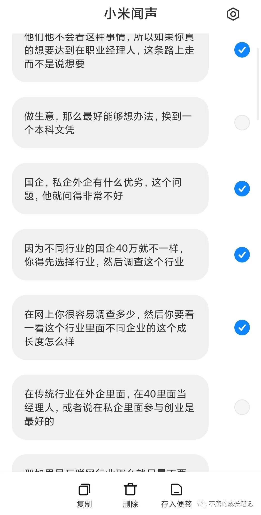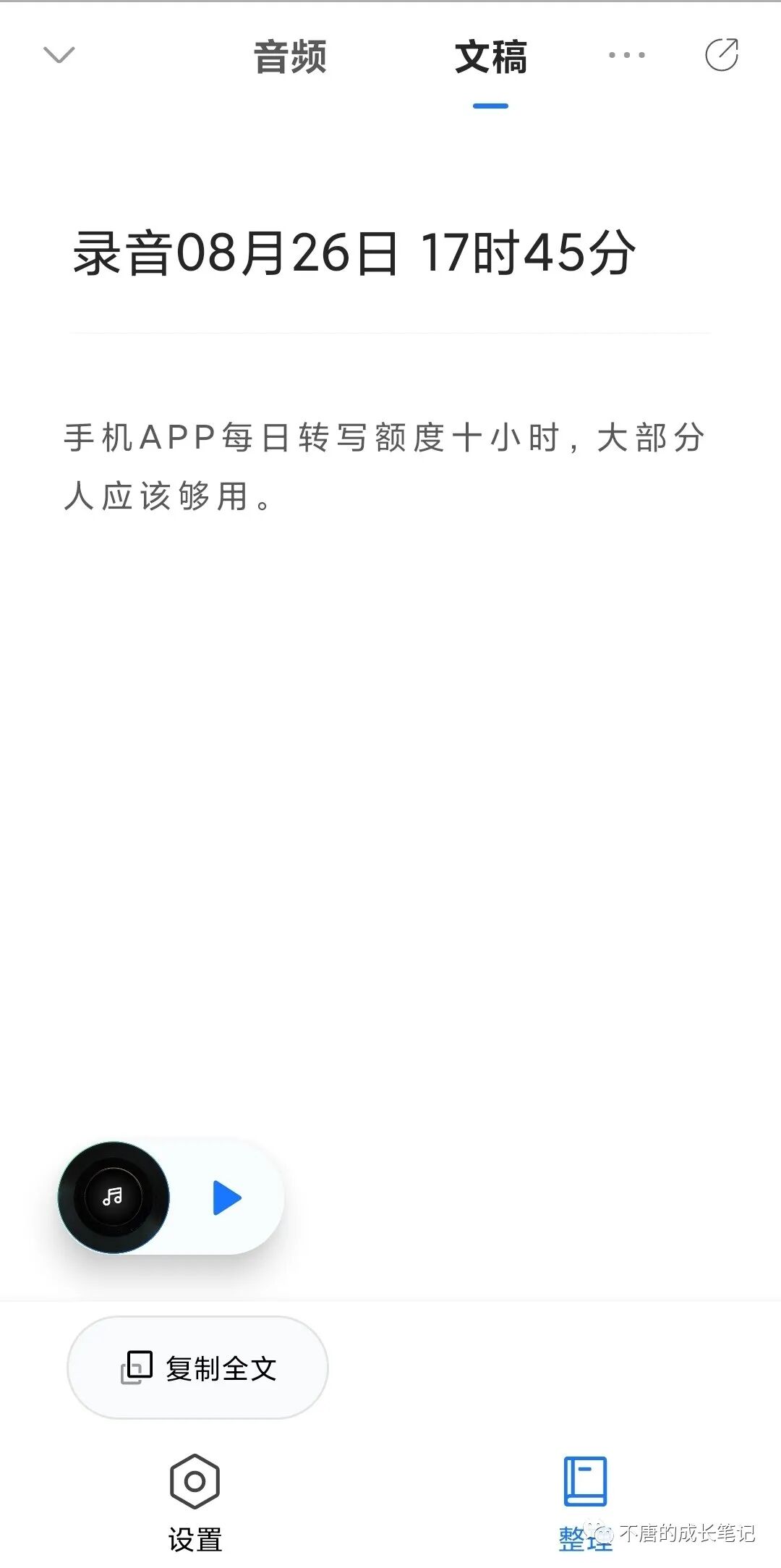 可自由选择转译好的文稿复制或存到系统便签。方便我们做课程笔记重点、会议记录重点。不足的是不能回听录音。