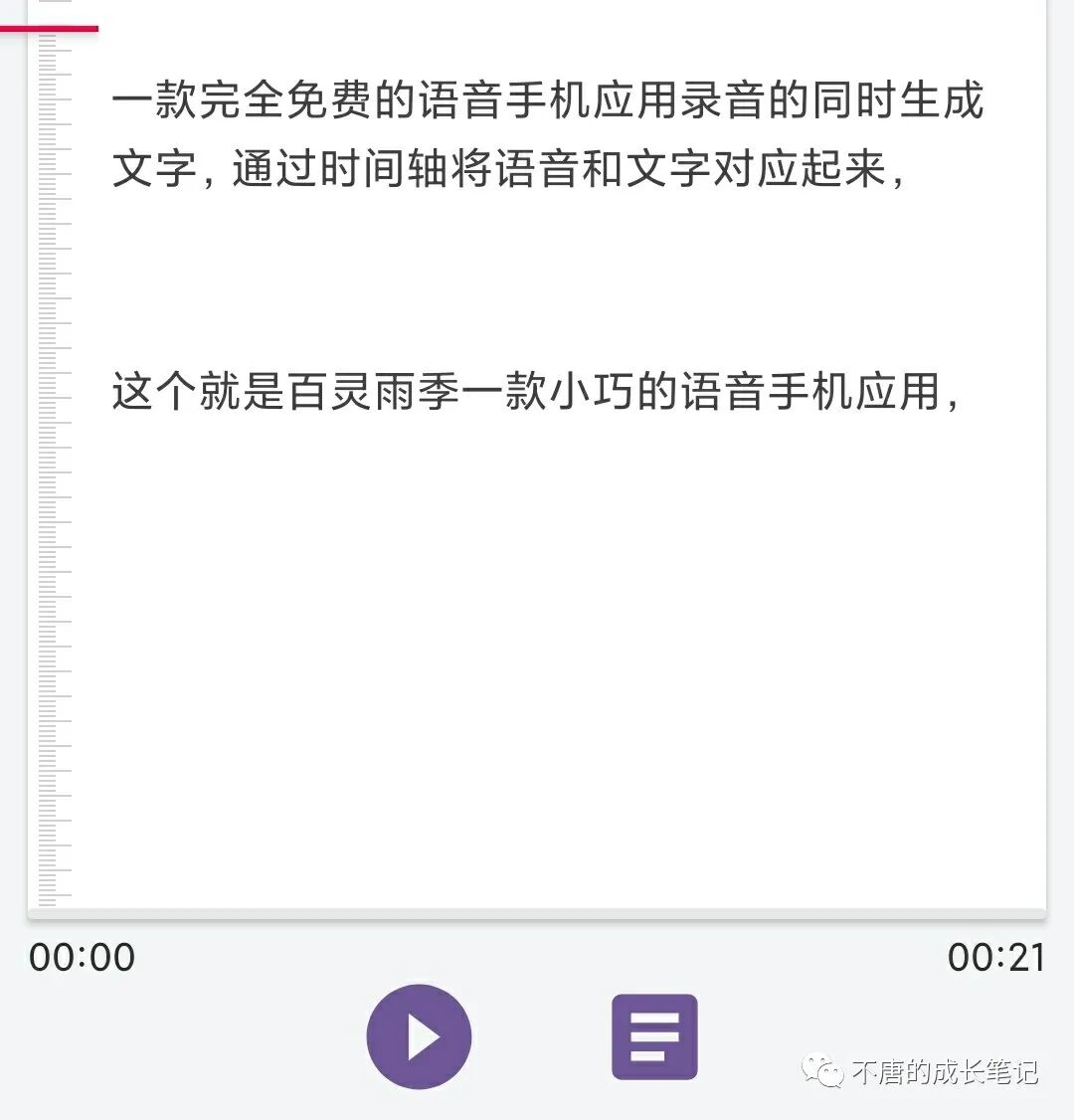 一款完全免费的语音速记应用,录音的同时生成文字。通过时间轴将语音和文字对应起来。