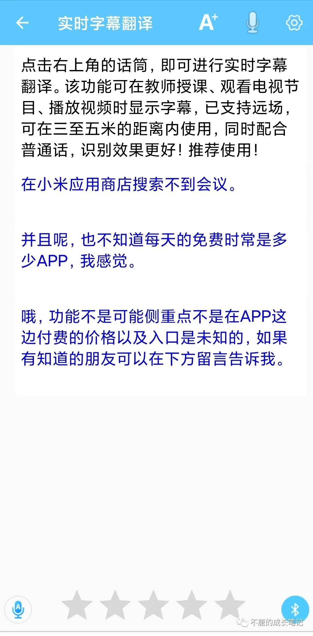 慧译和音书一样是从听障群体角度出发,只能实时语音转文字,不能录音转文字。有免费时长(具体未知),付费价格及入口未知。