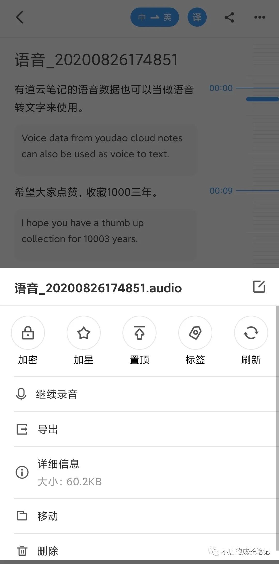并且还可以翻译每一句话。录完一次音,还可保存下次接着录音。文字和语音由右边的时间轴对应着。