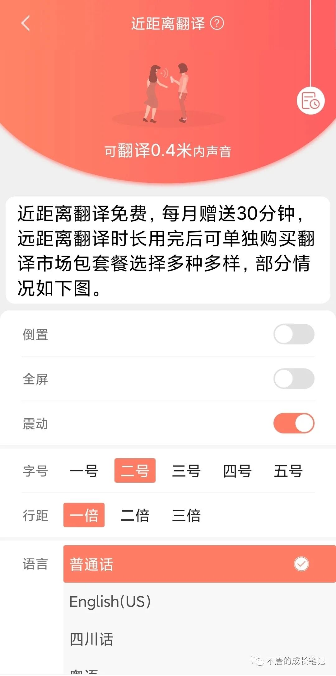 近距离翻译翻译获取0.4米内声音;远距离翻译轻松获取4米内声音;悬浮翻译一键接听电话,看视频直播。