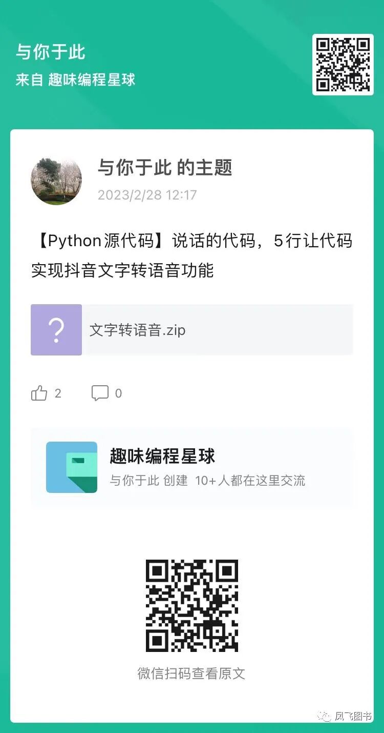 importpyttsx3word = pyttsx3.init()word.say(欢迎关注凤飞图书公众号)word.runAndWait()word.stop()