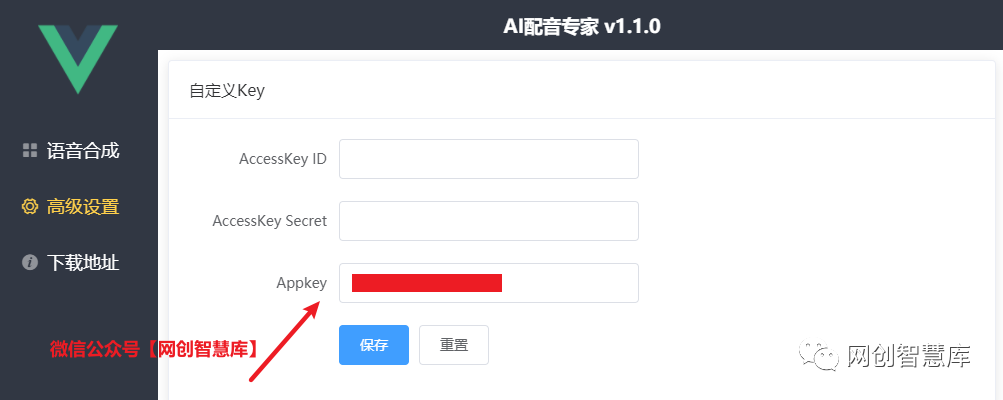 点击复制项目Appkey ,打开AI配音软件-高级设置。