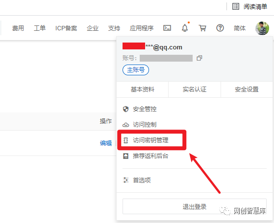 将鼠标箭头移动到页面右上角自己的头像上边,选择访问秘钥管理。