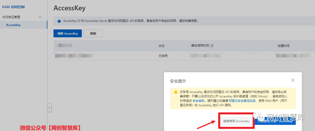 弹窗中选择继续使用 AccessKey;再选择创建AccessKey;