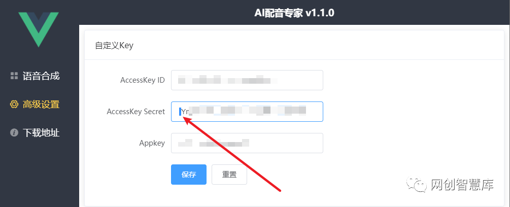 一般情况下,原因出在AI配音软件高级设置中 AccessKey Secret 选项这里。