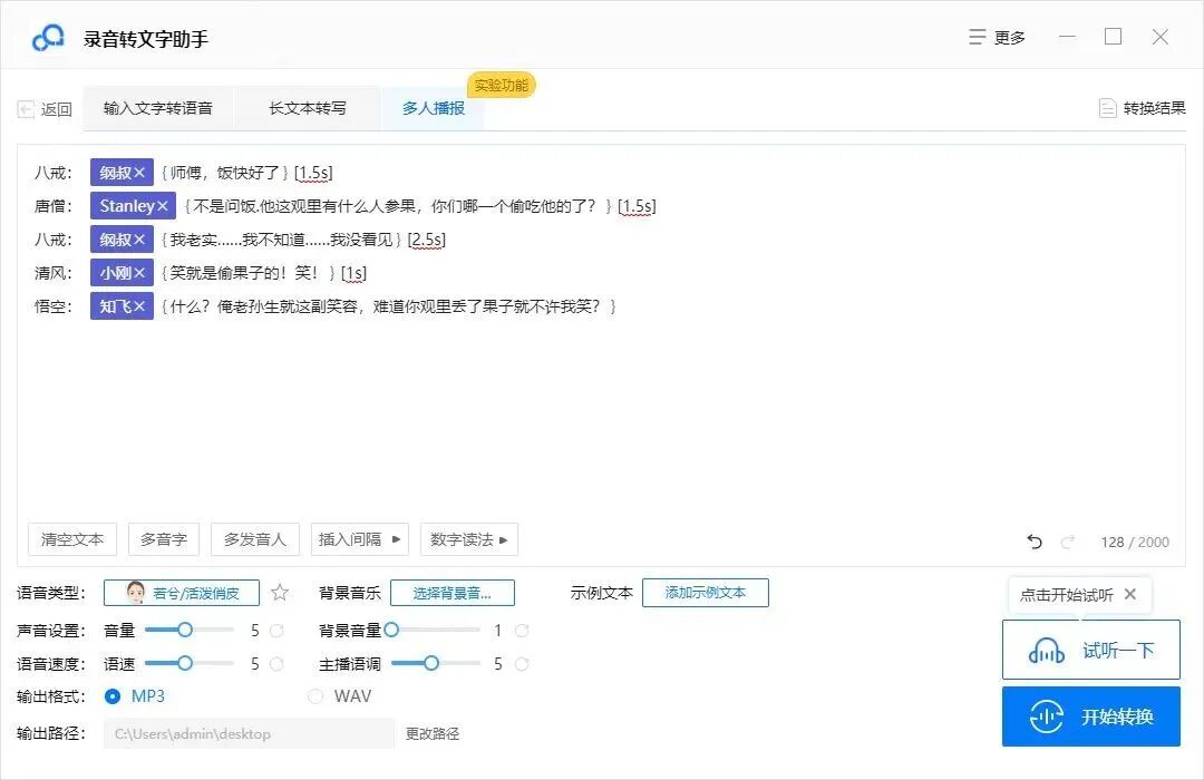 并且,软件还支持多人播报功能,可以为不同的角色设置不同的音色,从而模拟出一个
