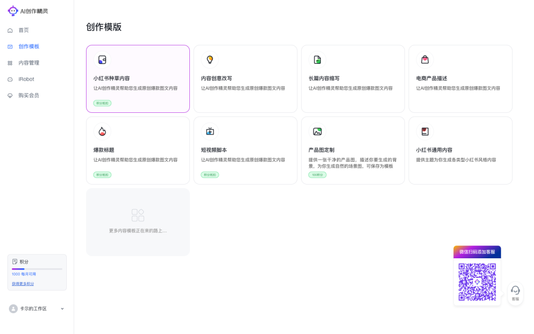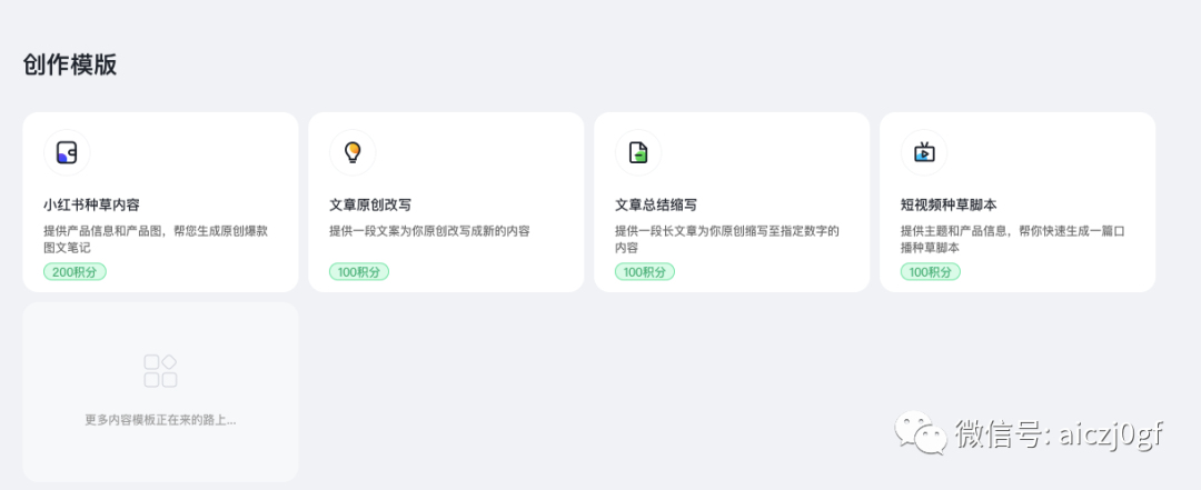 根据自己的需求,选择需要创作的内容类型例如小红书内容模板、原创改写、原创缩写等、短视频种草脚本模板。