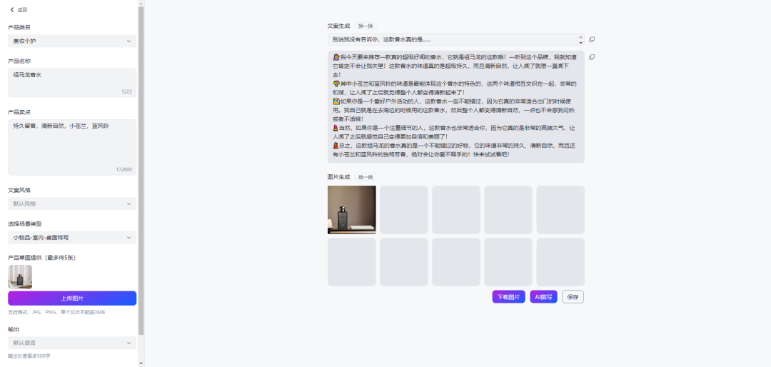 总之,使用AI创作精灵非常简单,用户只需要输入关键词和要求和产品底图,即可生成符合要求的文章和图片,提高内容创作的效率和质量。