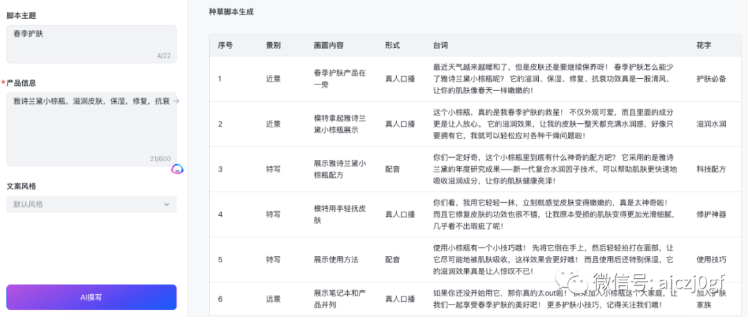 承接大量的种草短视频制作时,需要准备大量的种草脚本内容。AI创作精灵可以根据商品信息和主题,自动创作出符合要求的短视频脚本内容。