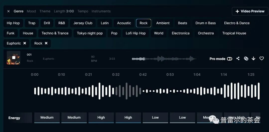 AI生成音乐之后,用户可以检查每一个小节,并且通过修改每一节的强度来调整旋律。强度分为四种:Low、Medium、High、Very High。