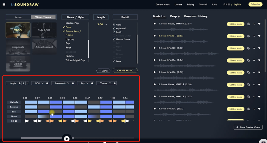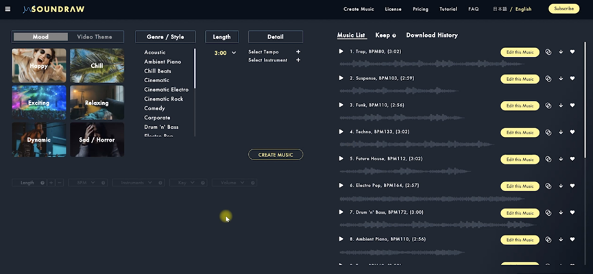 只需选择音乐创作的心情、流派和长度,Soundraw AI将为您生成优美的歌曲。