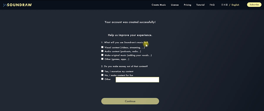 接着会出现两道问题,第一道问题的涵义是你使用Soundraw软件的目的是,我们选择了第一个选项视频需要;第二道问题的涵义是是否会使用Soundraw创作获利,我们可以选择没有,只是为了兴趣。接着点击继续按钮。