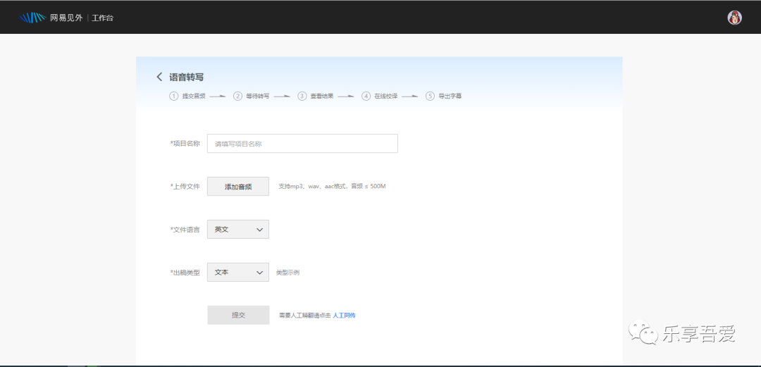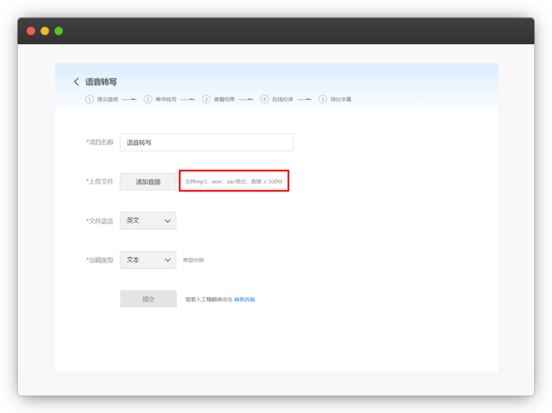 语音转写服务支持上传 mp3、wav 和 aac 格式的音频,文件大小不超过 500 M,文件语言可选择「英文」或「中文」,出稿类型选择「文本」。