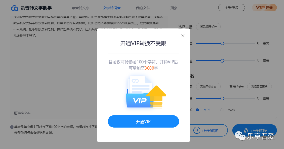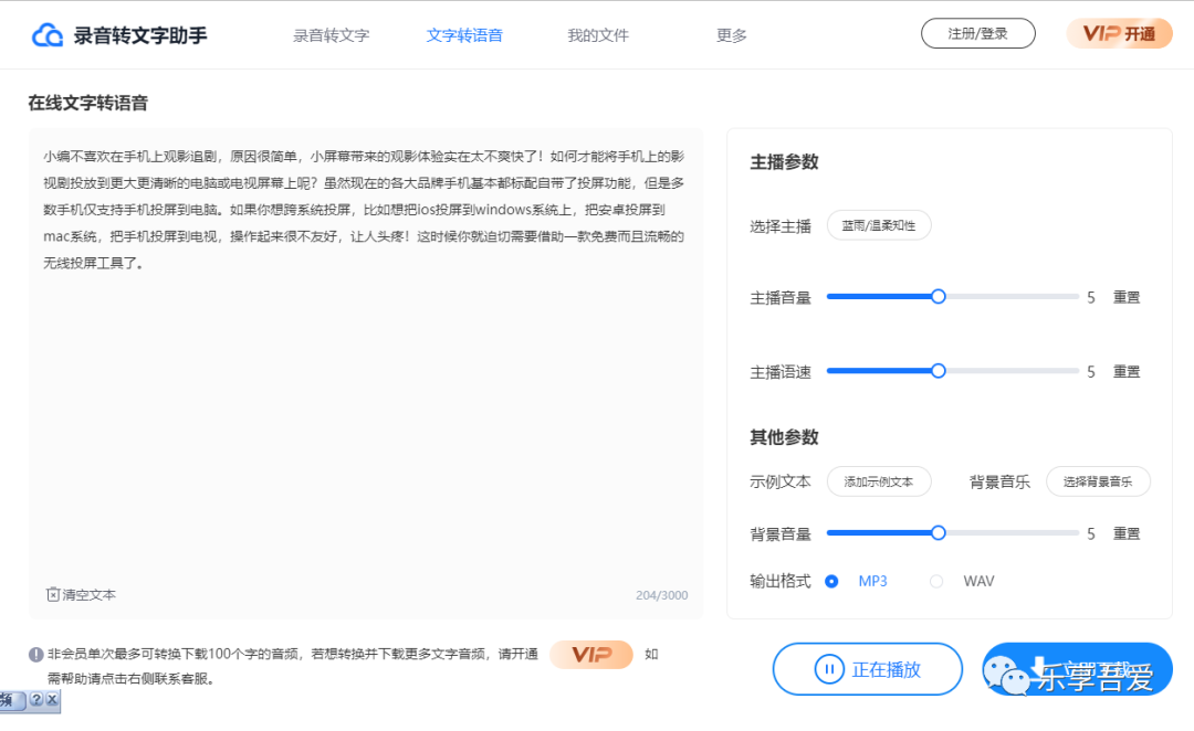 文字转语音,首先把文本复制粘贴到文本框,然后选择主播,还可以设置音量和语速,选择背景音乐和输出格式,所有的设置选择完毕后,点击"试听一下",即可播放。非会员单次最多可转换下载100个字的音频,若想转换并下载更多文字音频,请开通 VIP。