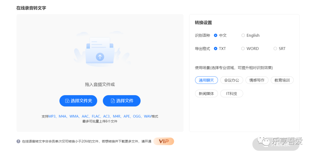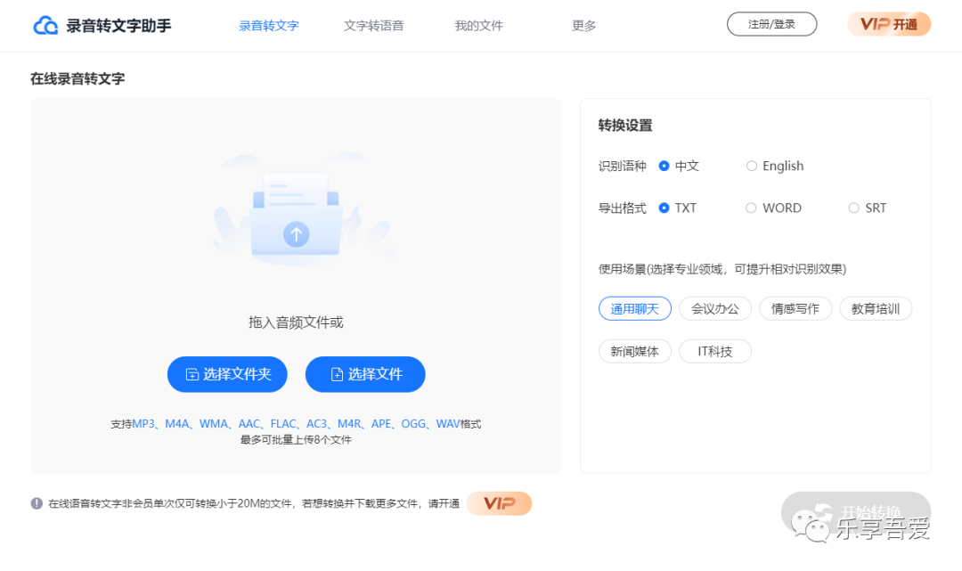 在线录音转文字支持MP3、M4A、WMA、AAC、FLAC、AC3、M4R、APE、OGG、WAV格式,最多可批量上传8个文件。首先选择文件夹或文件导入,然后在右侧设置识别语种和导出格式,然后点击"开始转换",稍等片刻就能提取音频中的文字。在线语音转文字非会员单次仅可转换小于20M的文件,若想转换并下载更多文件,请开通VIP。