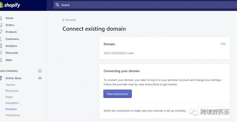 第4步:View instructions 点开后会有shopify官方展示的域名解析步骤,如果不明白也没关系,我们看下一步