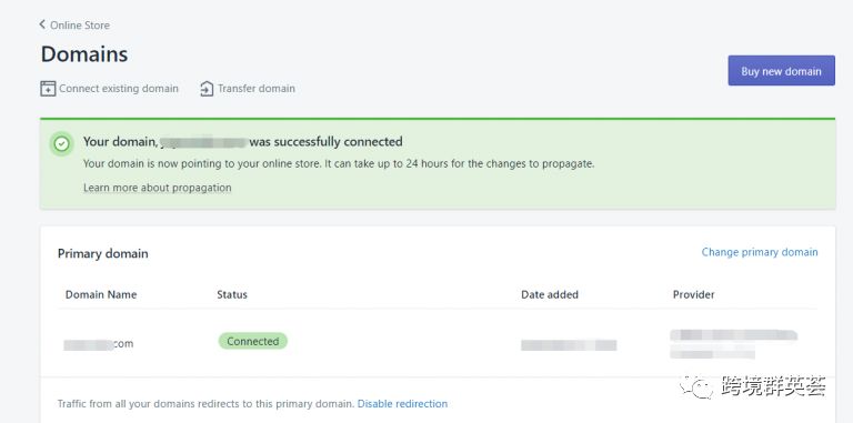 第2步:在这里我们可以看到Shopify已经为我们的独立站绑定了一个后缀为myshopify.com的二级域名,而且是我们目前的主域名。等我们完成新的域名解析后,就可以change primary domain 更改成新的域名就行。另外可以看到右上角会有Shopify内置的Buy new domain 购买新的域名选项,不需理会,直接点击 connect existing domain连接现有域名按钮。