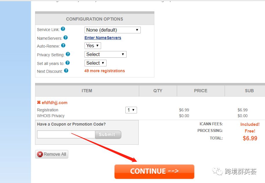 把我们想好的域名选中,点击下面的checked domains跳转到付款界面,第一次购买需要注册一个账号,注册好之后继续购买